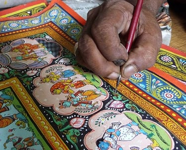 Pattachitra painting is a traditional Indian art form that originated in the state of Odisha and parts of West Bengal. Artists use natural pigments derived from minerals, vegetables, and other organic sources the painting process involves fine brushwork and a strong emphasis on decorative borders.